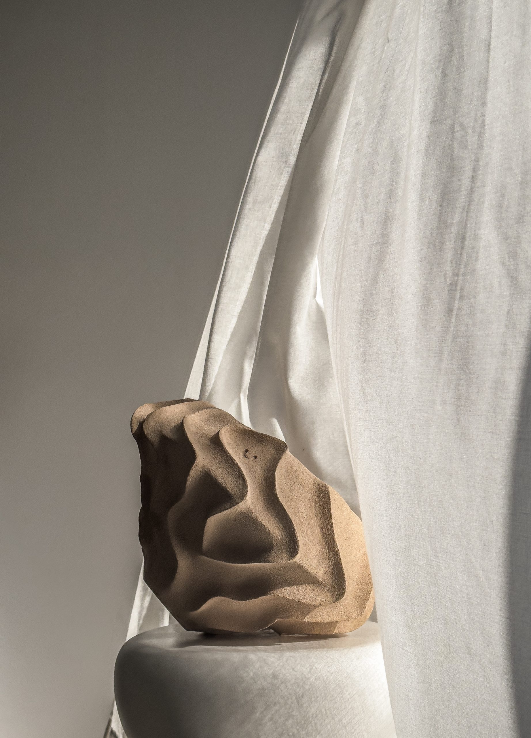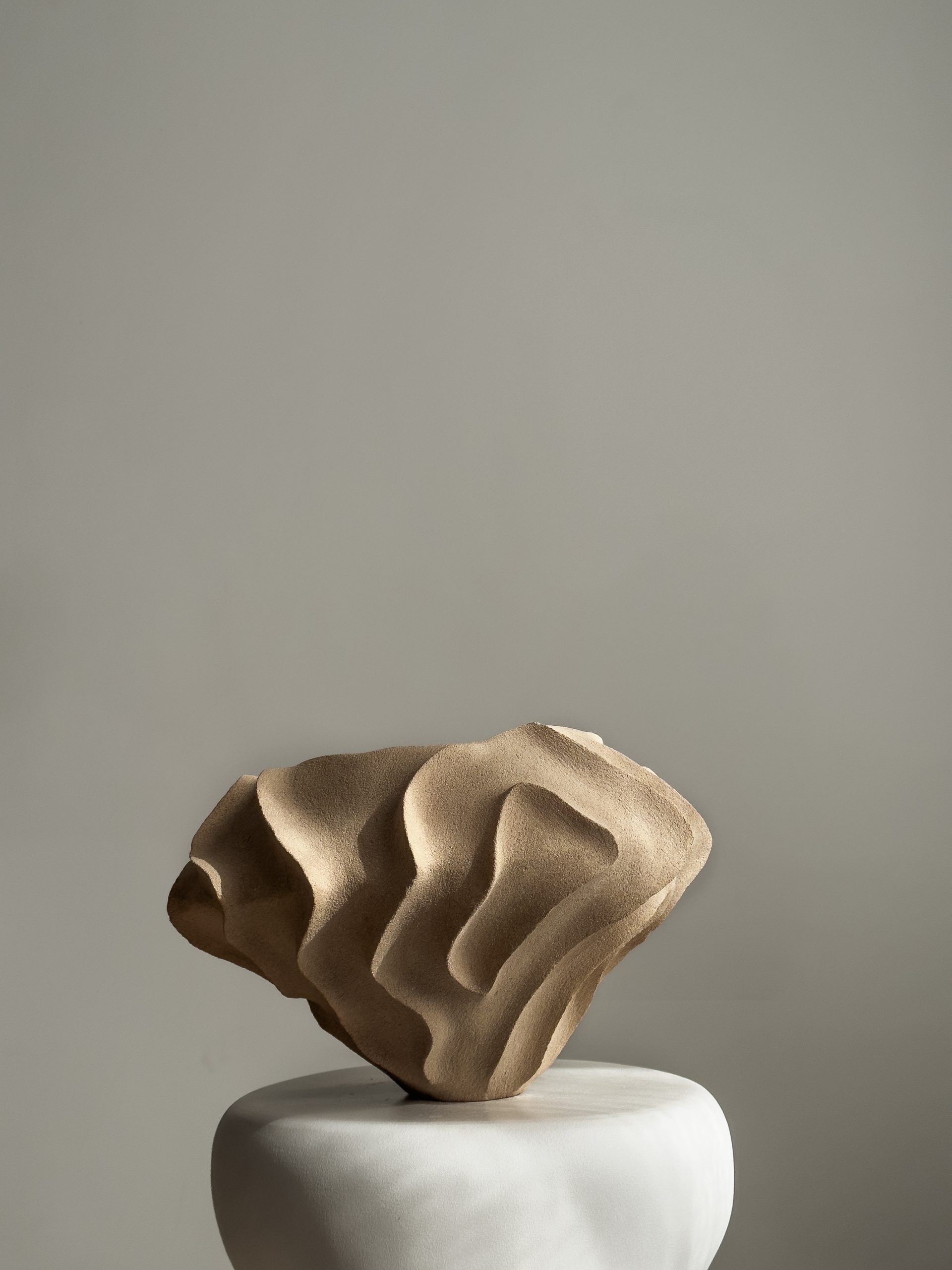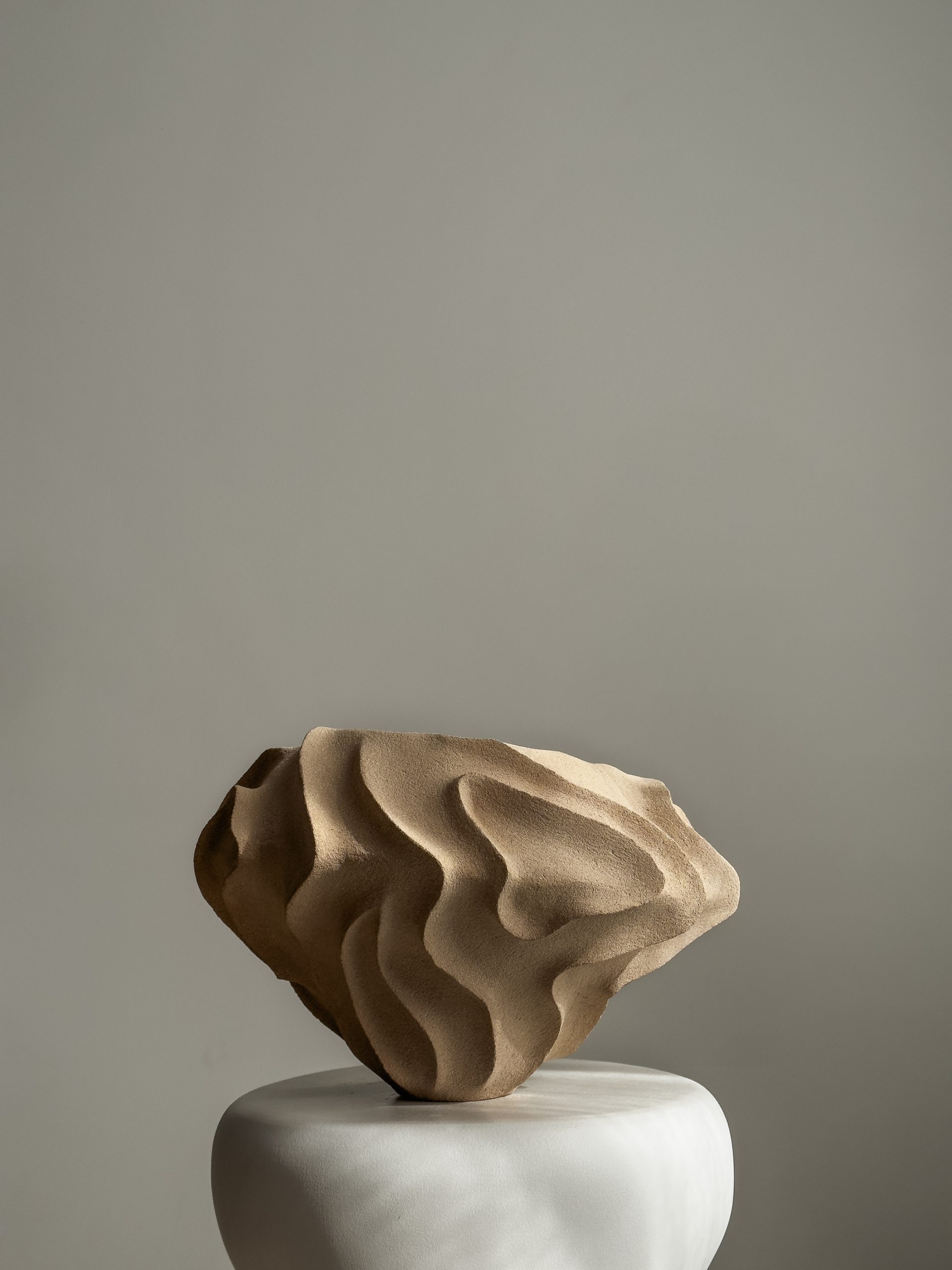 Meticulosamente lijada a la perfección, la superficie del jarrón exhibe una textura uniforme y arenosa que invita a ser tocada y admirada.